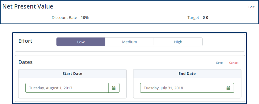 - Once you have added organizations to the project, you will need to fill out an investment target, benefit target, discount rate for NPV, effort, and dates for the project timeline.